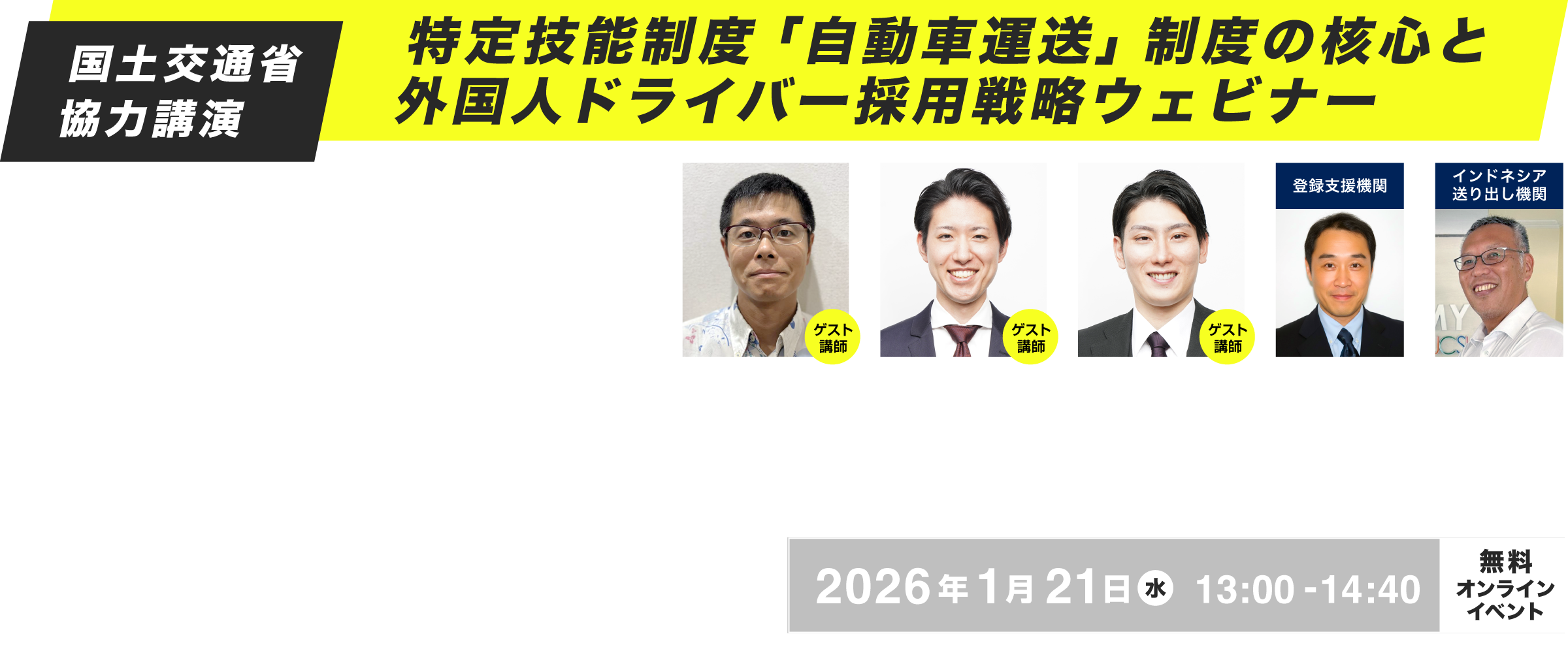国土交通省 協力講演:特定技能制度「自動車運送」制度の核心と外国人ドライバー採用戦略ウェビナー 輸送業界の持続可能な人材確保へ。制度の"現在地"解説と、海外提携ルートを活用した日本式即戦力育成の秘密を大公開。 |